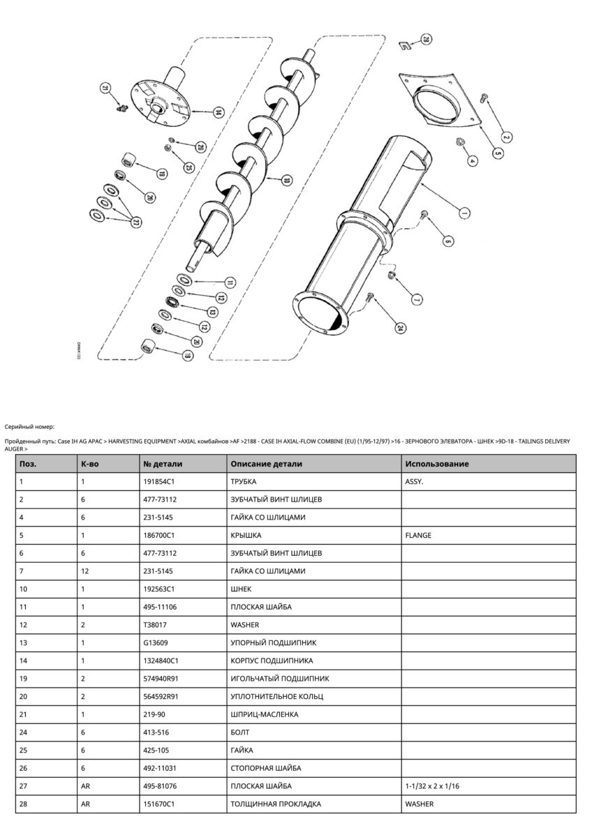 Каждая запчасть и деталь из которой состоит комбайн CASE 2188 имеет свои уникальный номер. Такая нумерация составных частей техники необходима для упрощения процесса учета, логистики, хранения. Учитывая большое количество запчастей из которой состоит техника, огромный модельный ряд и поставки техники и запчастей практически по всему миру, нумерация является необходимостью. В такой системе нумерации деталей работают практически все ключевые игроки машиностроительного рынка. Также в такой системе работают фирмы торгующие запчастями КЕЙС.