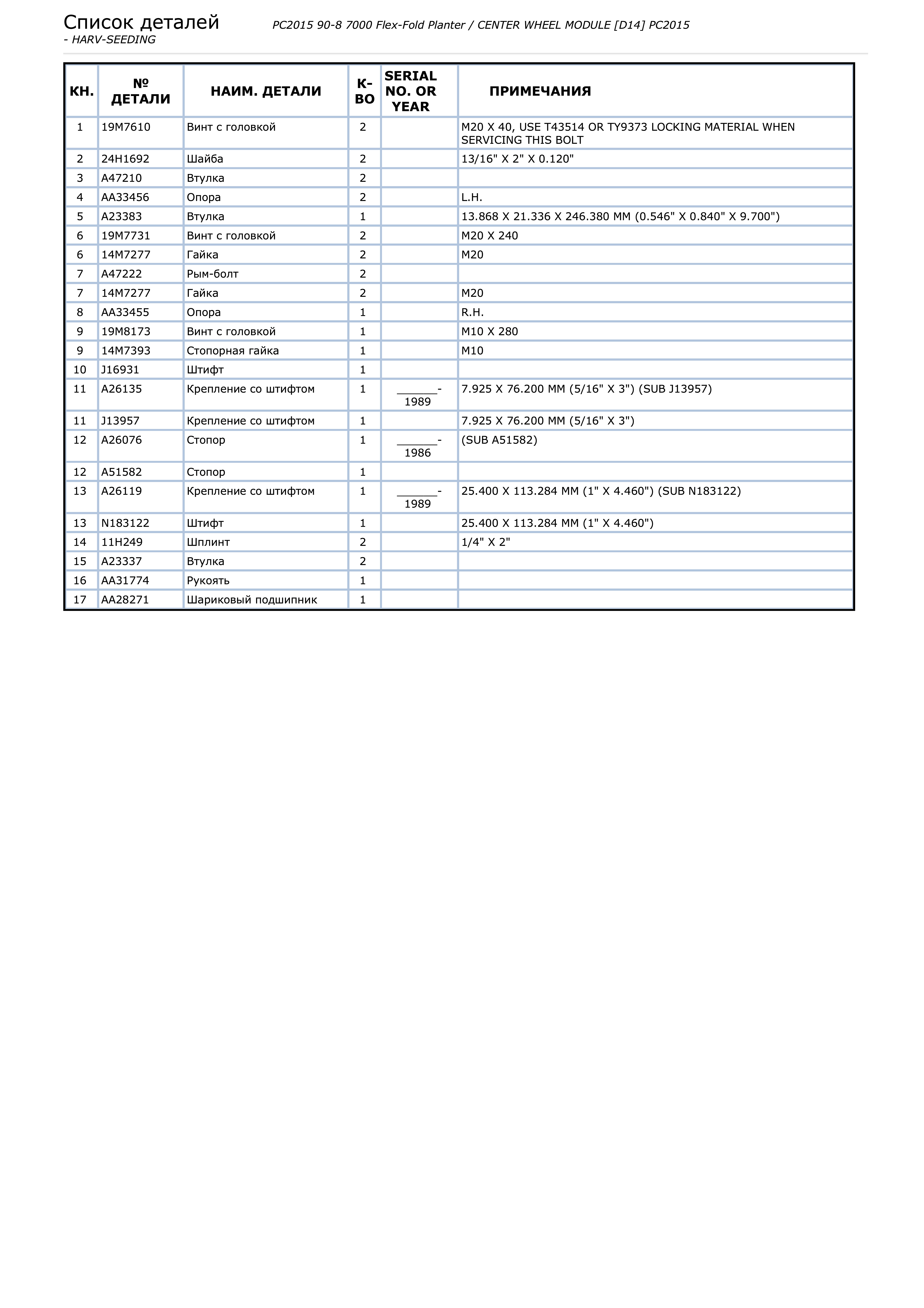 - Страница с каталожными номерами и наименованиями деталей из каталога сеялки Джон Дир 7000